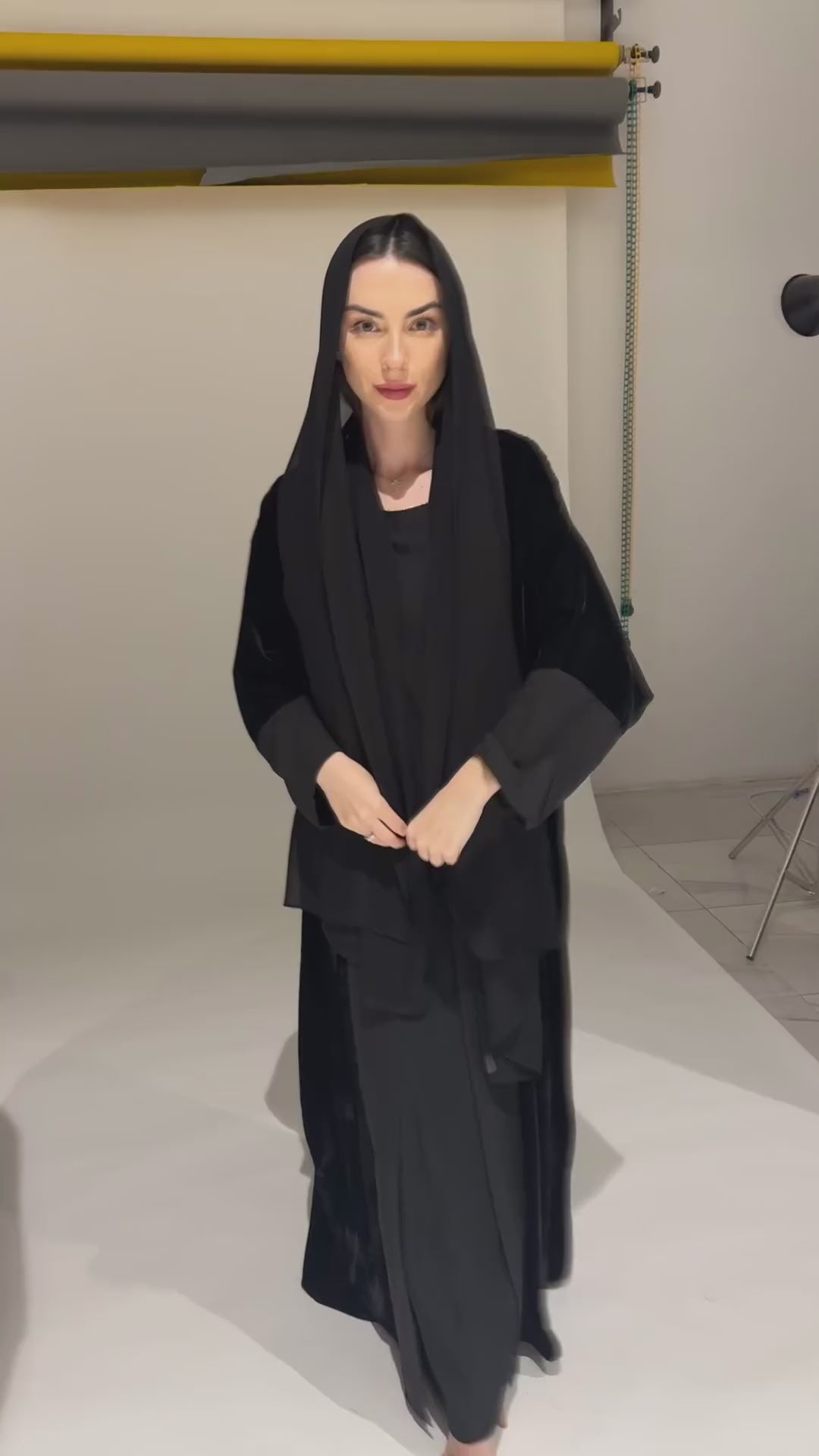 ALNOUD in black is a plush velvet abaya paired with a matching shawl. The rich fabric offers warmth and comfort, perfect for evening family gatherings or cozy cultural events.