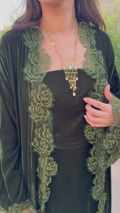 CAMELLIA – Deep Green Velvet Abaya With Lace (Inner Included)