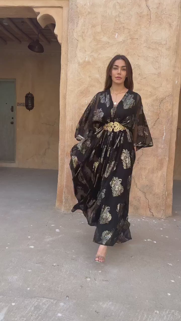 CELINE in black features a flowy chiffon and silk blend, adorned with subtle black motifs throughout. The included inner belt gently shapes the silhouette, making it a lovely choice for daytime family gatherings or relaxed social occasions.