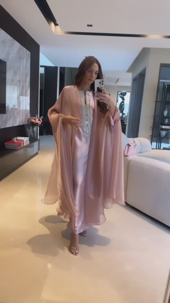 This pink DALIA kaftan blends soft chiffon-silk with silver handmade embroidery and light strass work, paired with an elegant organza cape. Designed for comfort and grace, it’s ideal for daytime occasions or hosting guests at home.