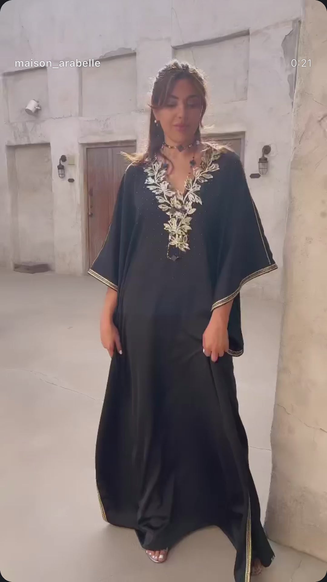 Offered in deep black satin crepe, FAYROUZ features soft handmade floral embroidery, silver bead accents, and fine lace along the edges. The V-shaped neckline keeps it refined, and the fabric drapes gently for all-day comfort. Ideal for morning events or hosting with ease.