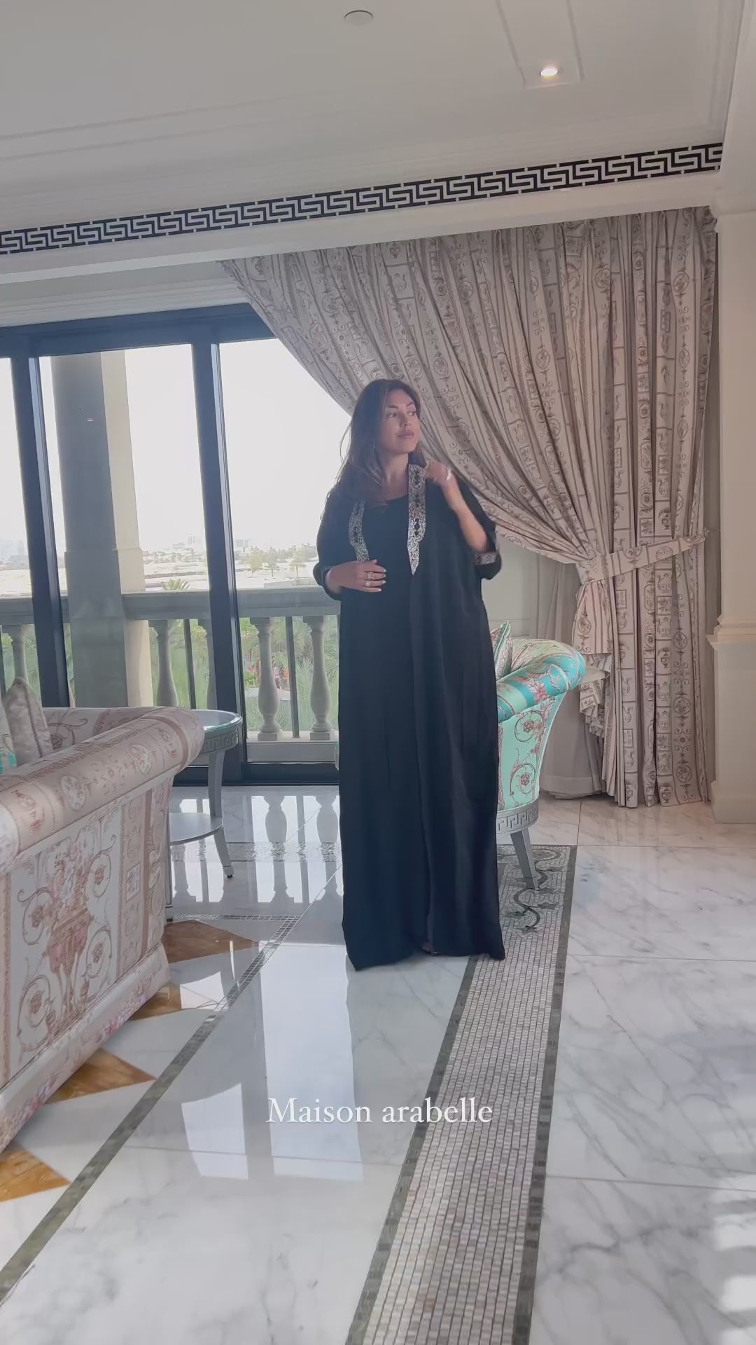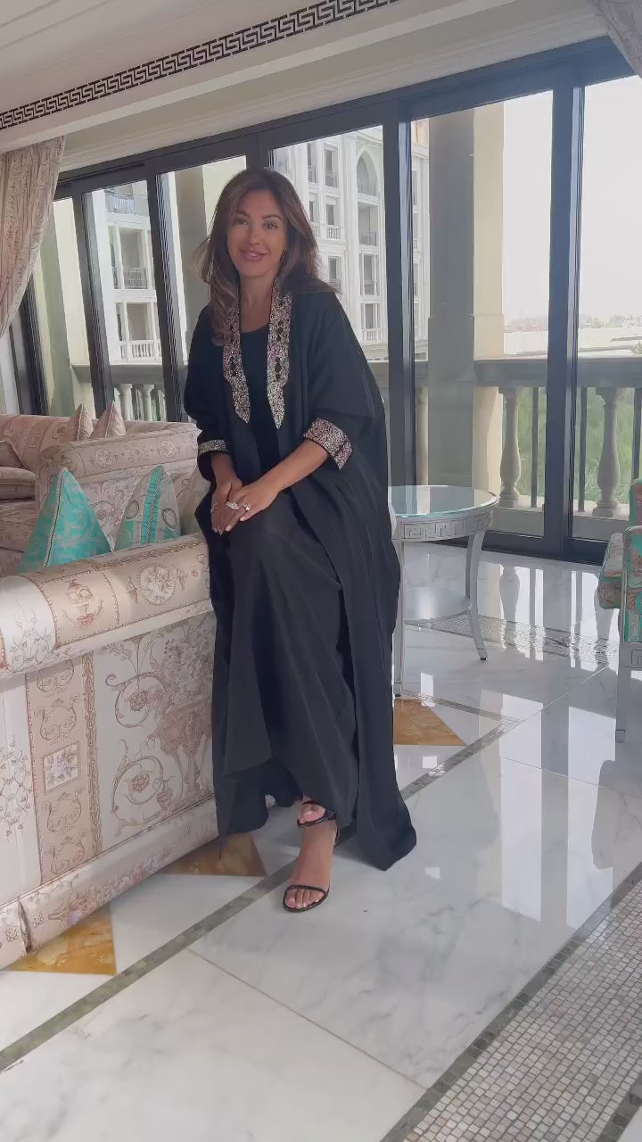 LADIA in black is a fine linen abaya featuring handmade colorful embroidery along the front and cuffs. Paired with a soft inner, it’s an easy choice for casual family gatherings or coffee outings with close friends.