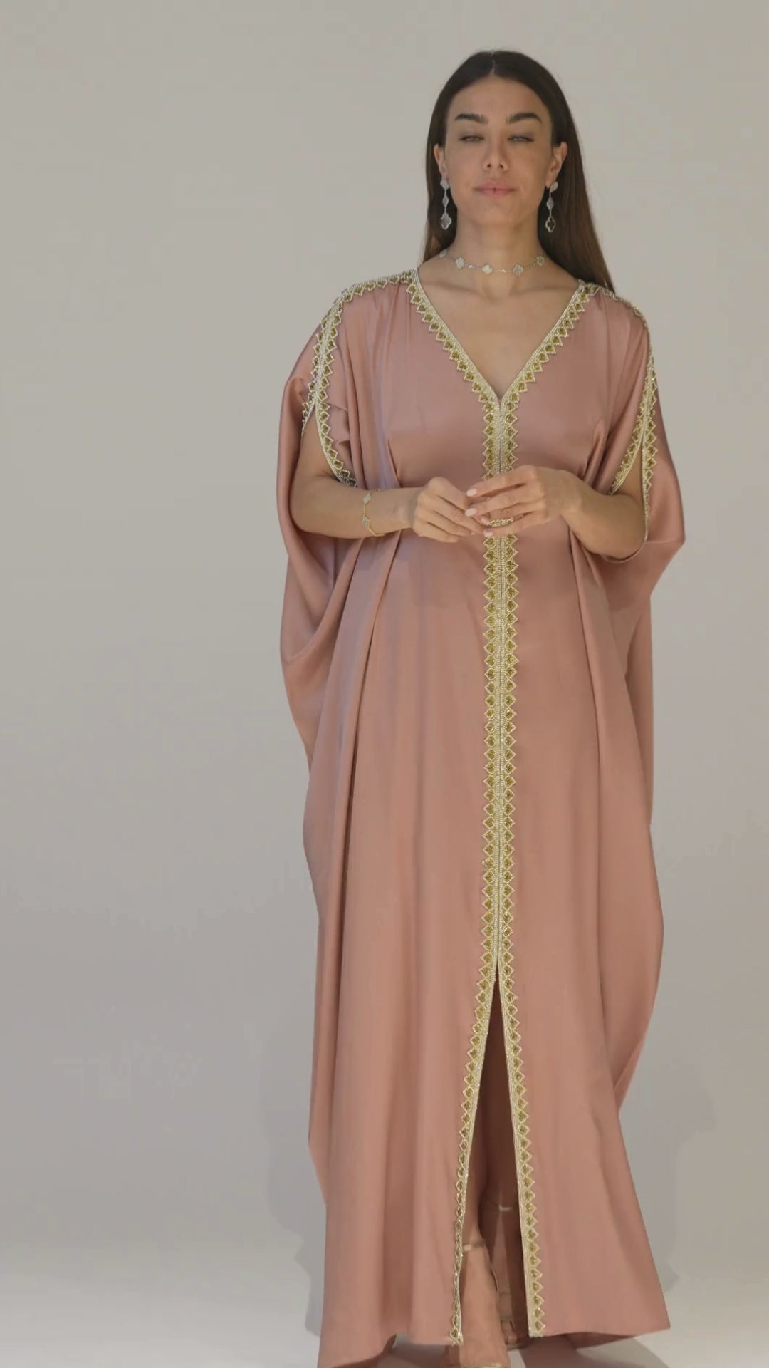 This pink MAYS kaftan combines soft satin silk with delicate silver lace, highlighted by its flowing sleeves and flattering V-neck. Designed for comfort and style, it suits celebrations and casual get-togethers alike.