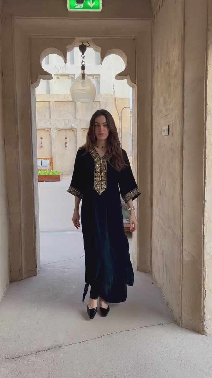 This dark green RAJOUA kaftan features a flowing chiffon-silk blend with a soft cape that adds movement. Its simple charm makes it ideal for cultural evenings or quiet social visits.