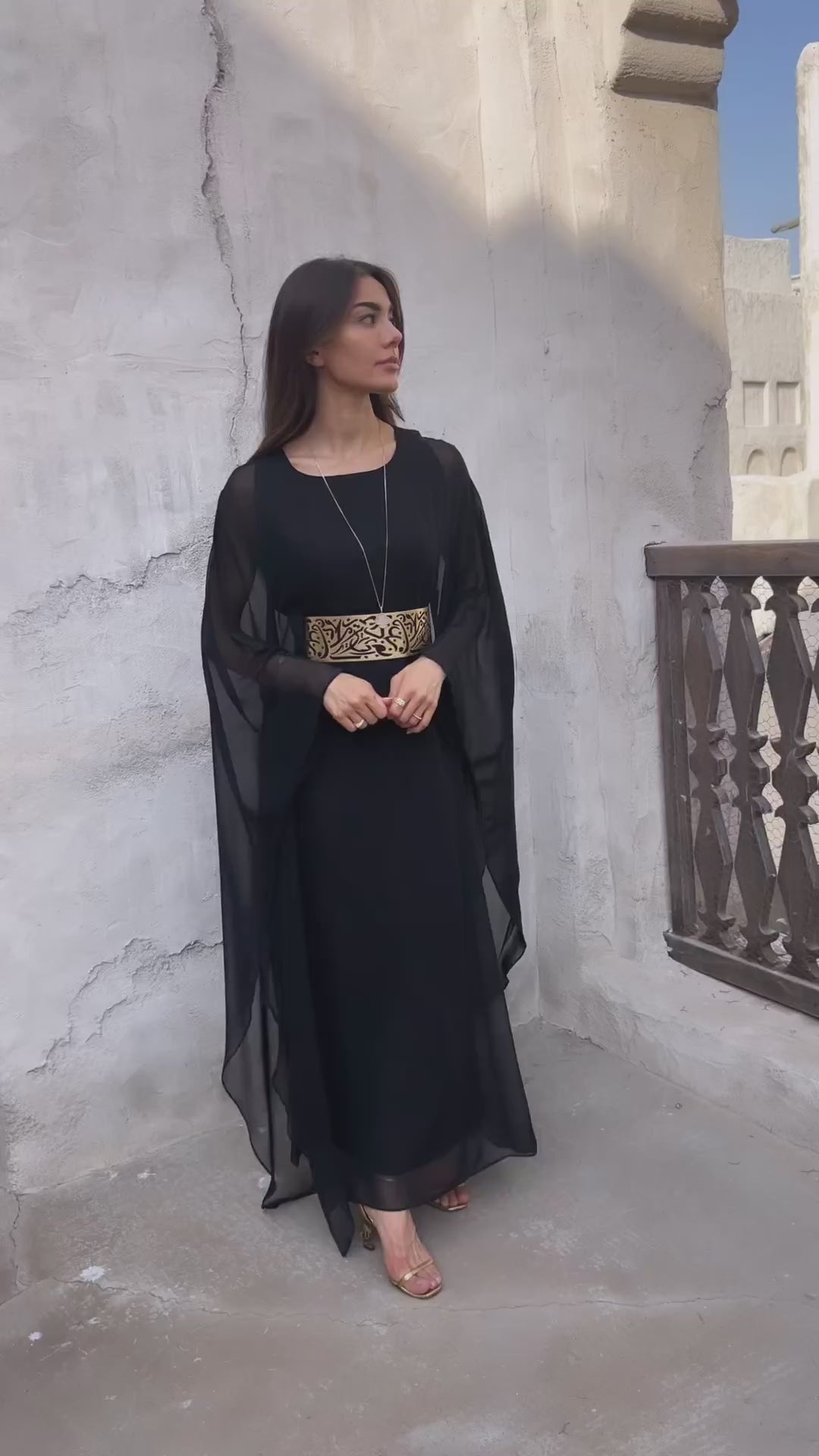 RANA in black features a flowing silk fabric adorned with soft blue motifs throughout. The open design moves gracefully, and the included belt adds gentle shaping. Ideal for daytime family gatherings or relaxed cultural visits.