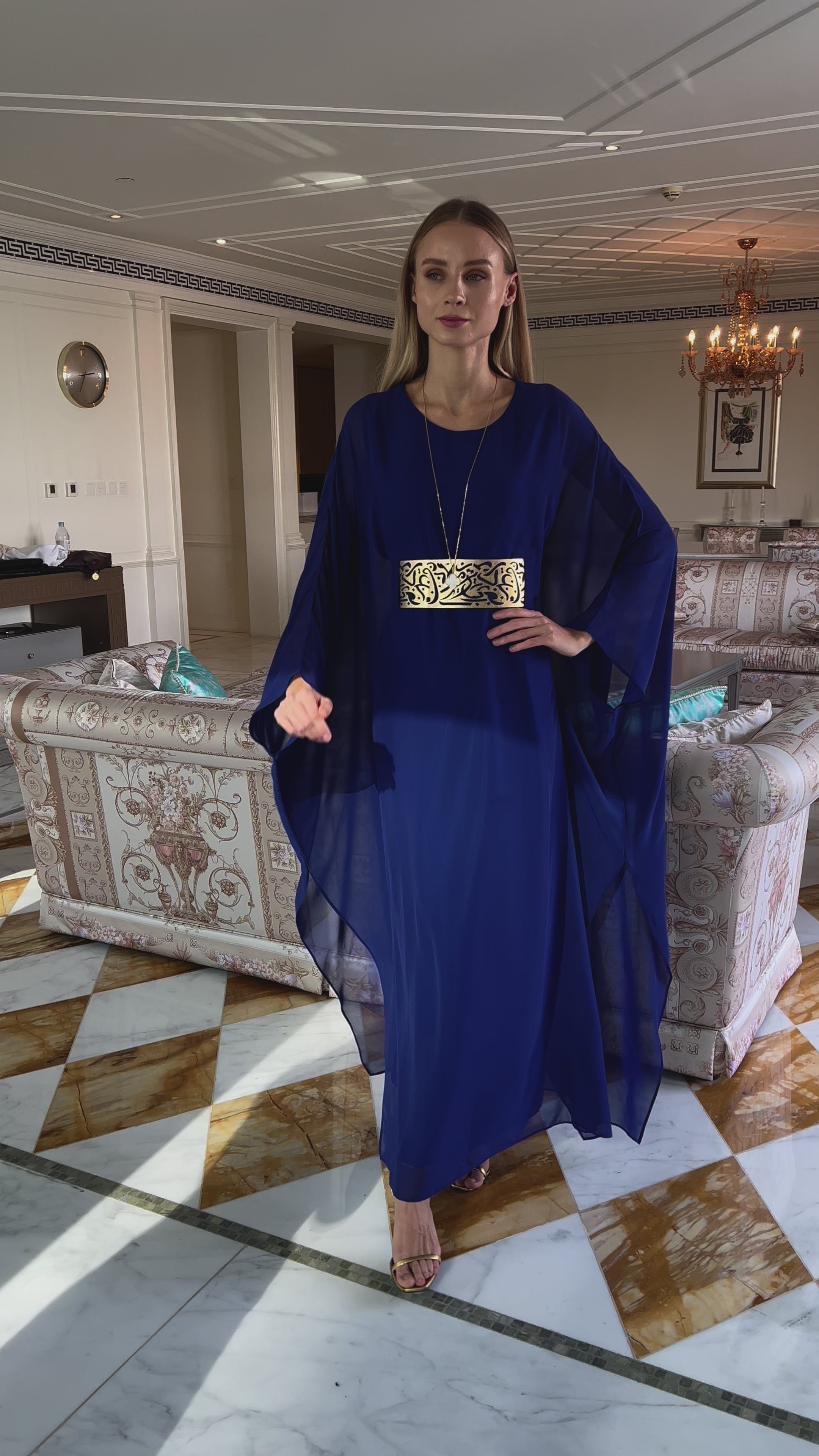 RANA in blue showcases a smooth silk fabric covered in delicate blue motifs. The open silhouette flows effortlessly, while the belt offers a tailored touch. A lovely pick for daytime family events or casual social occasions.