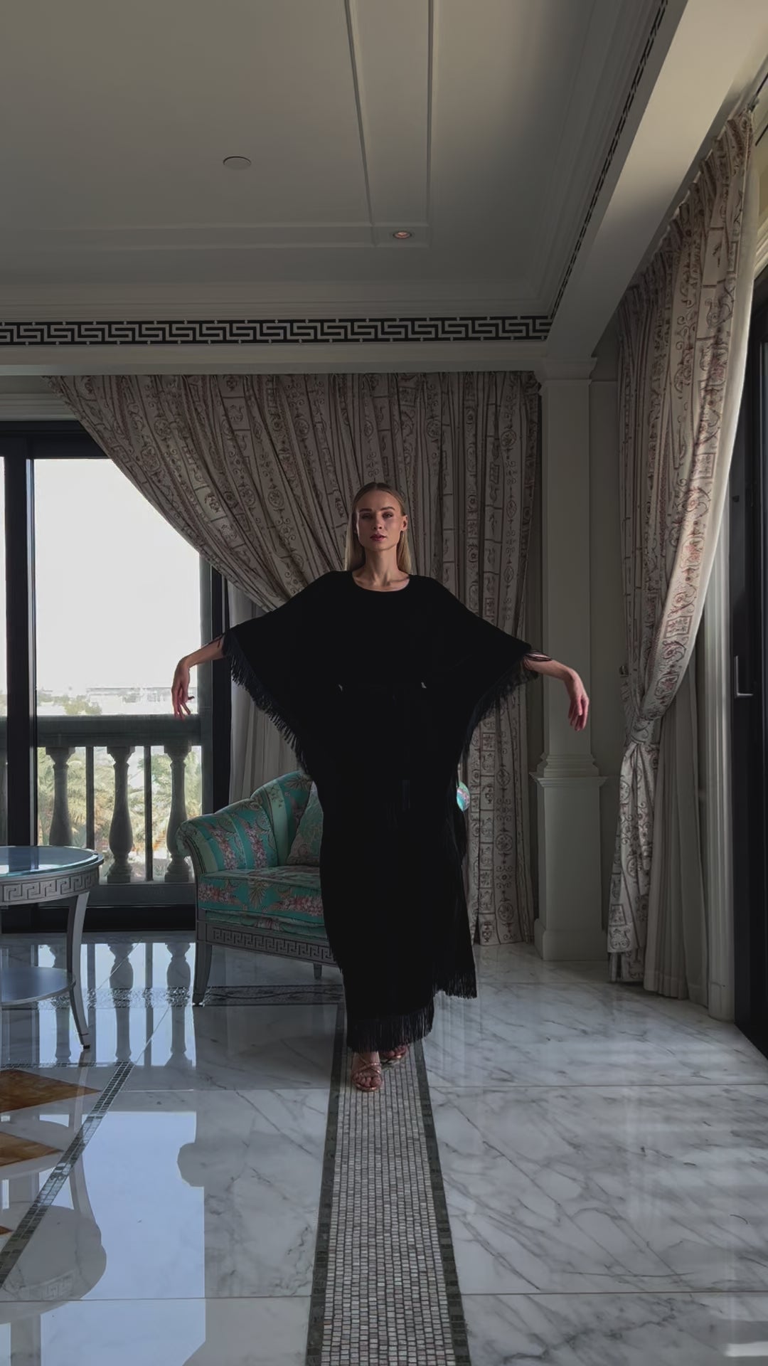 This black REEM velvet kaftan offers a smooth, plush texture with subtle tassels adding a stylish touch. The included belt shapes the silhouette softly, making it a refined choice for evening visits or cultural events.