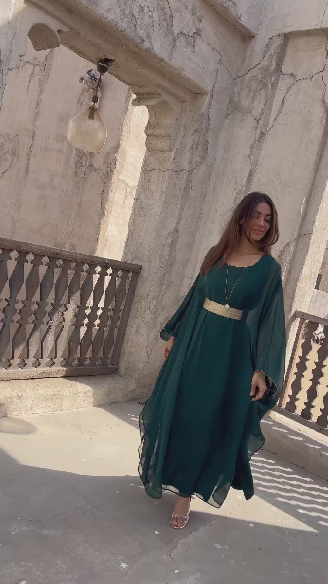 RUBI features a light and airy silk chiffon fabric, designed in an open, flowing silhouette with soft green motifs throughout. The included belt offers gentle shaping, making it an easy choice for daytime family gatherings or relaxed visits.