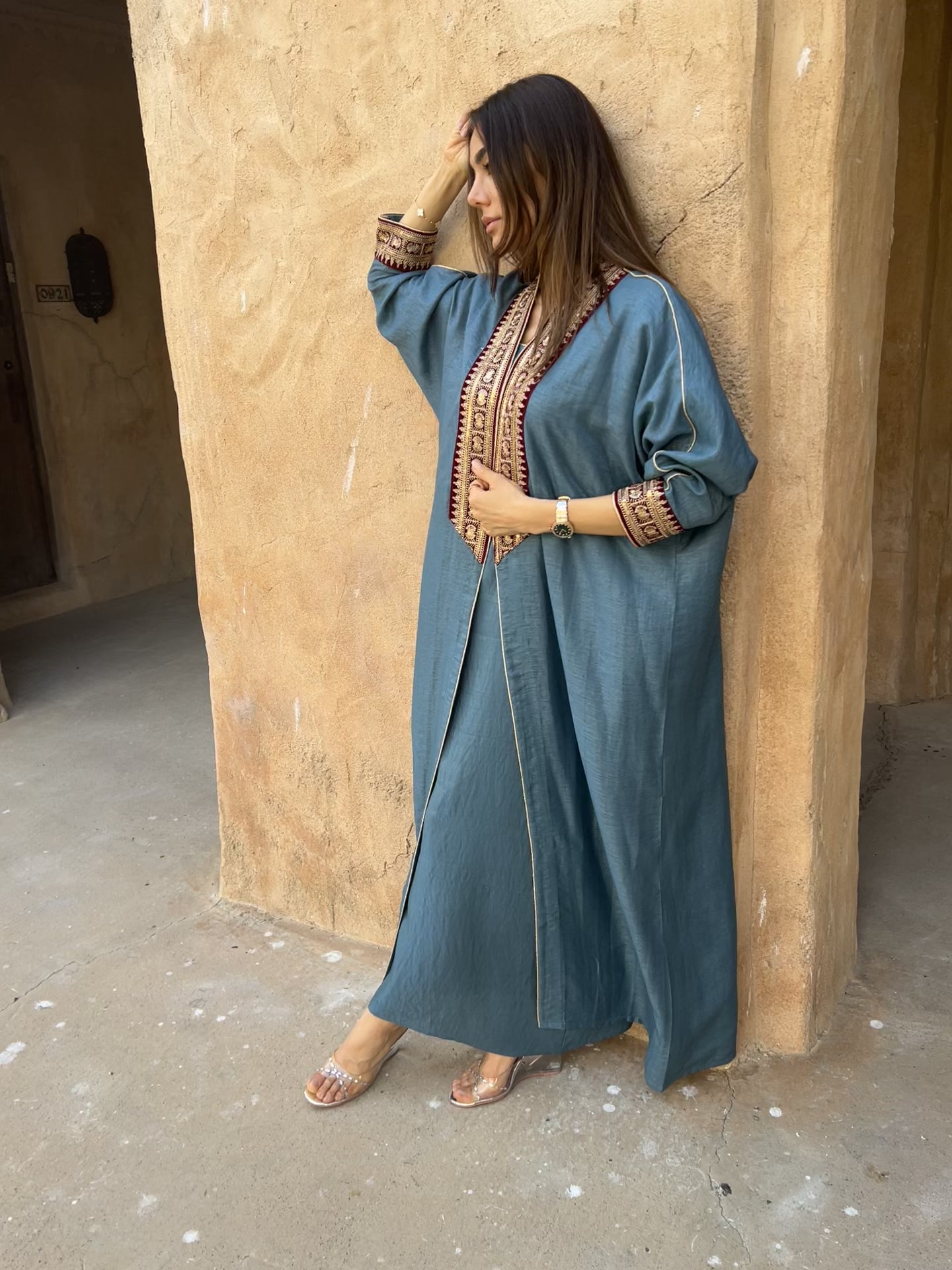 SAFEYA is crafted from fine linen, offering a soft, breathable feel ideal for all-day comfort. The abaya is beautifully enhanced with handmade gold lace, adding a gentle touch of sophistication. Perfect for cultural gatherings or casual family visits.
