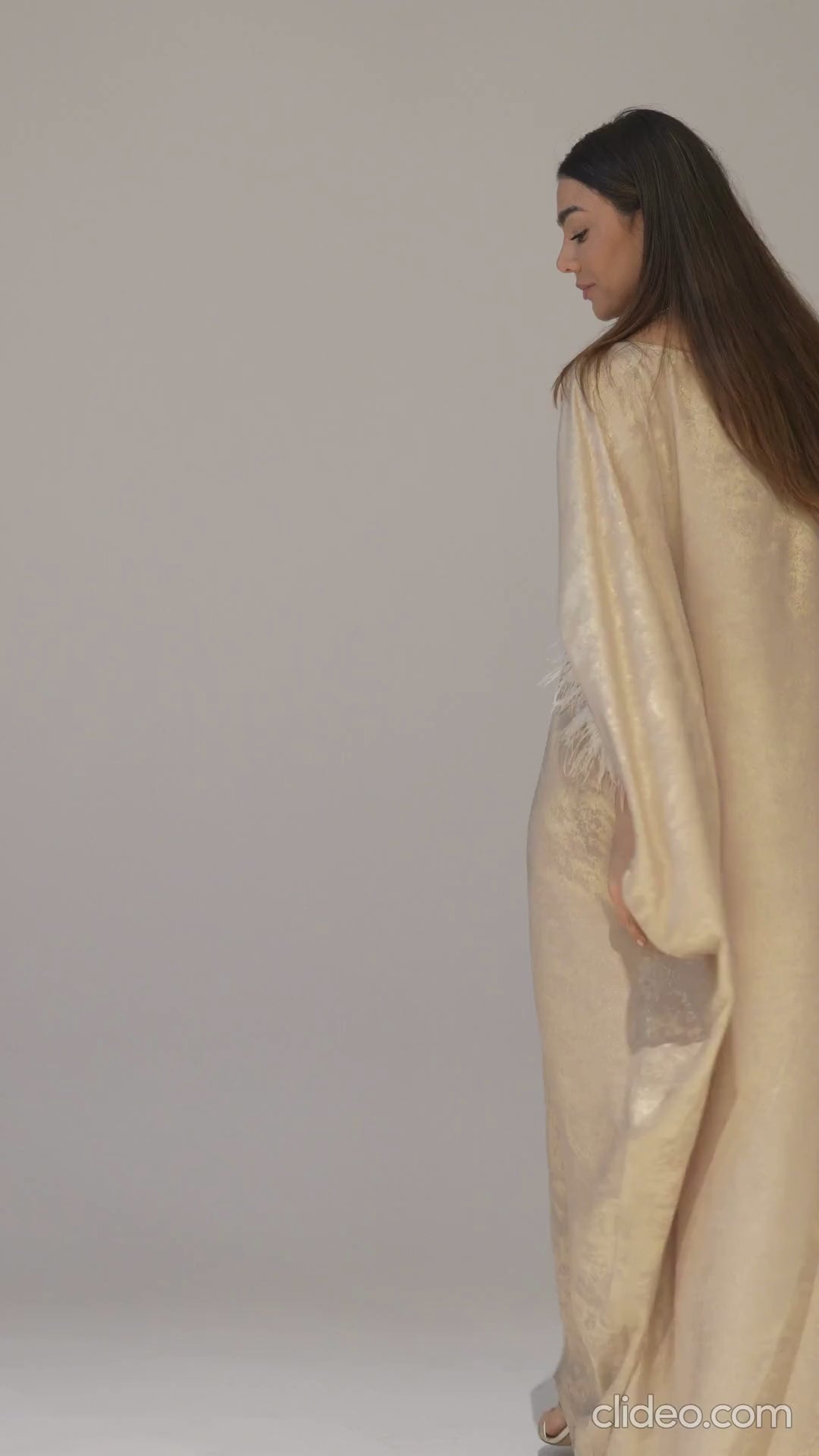 SHAMAA is a graceful champagne kaftan dress with a flowing silhouette and batwing sleeves. The feathered cuffs add a soft, delicate touch, while the inner belt provides a flattering fit. Ideal for special family occasions or elegant native gatherings.